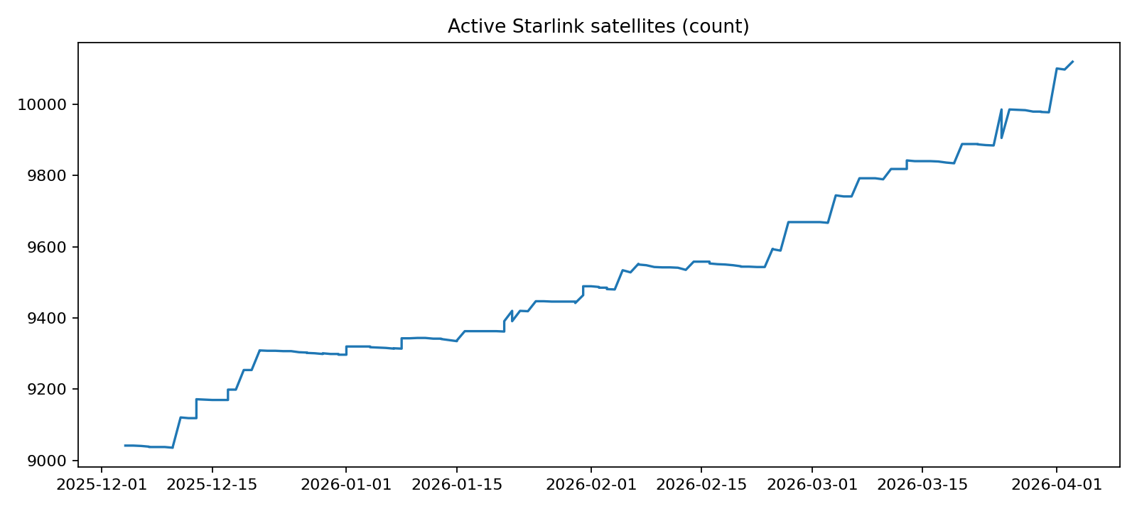 CelesTrak Starlink GP/CSV — Active Starlink elements, orbital parameters, and counts used to understand constellation scale and decay eligibility.